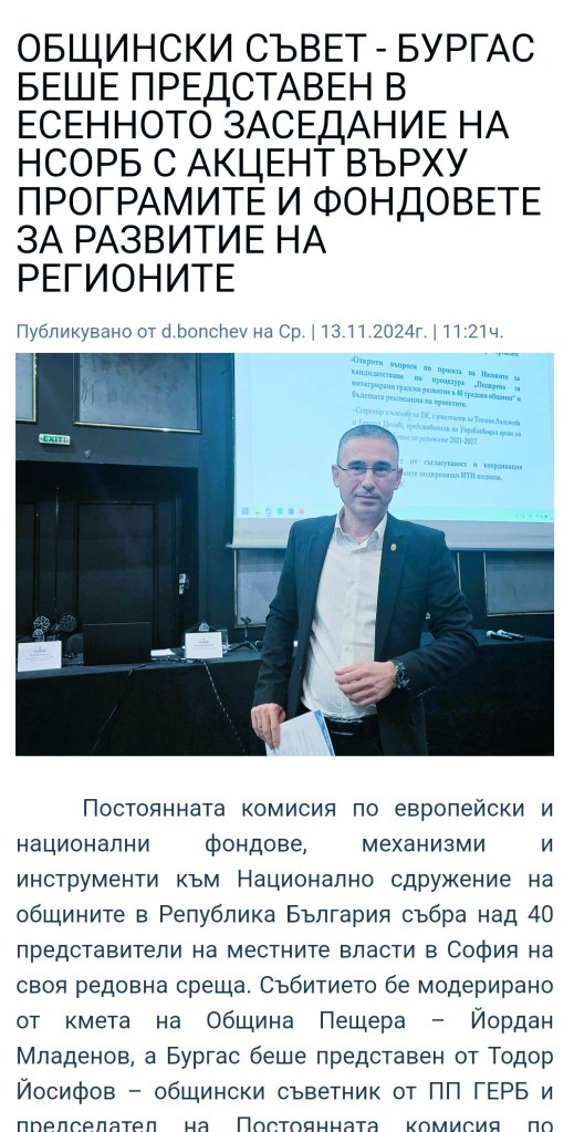 Председателят на Постоянна Комисия “Икономика и Инвестиционни Политики” към Общински Съвет в морския град – Тодор Йосифов е избран за втори пореден мандат да представлява бургазлии в местния парламент.